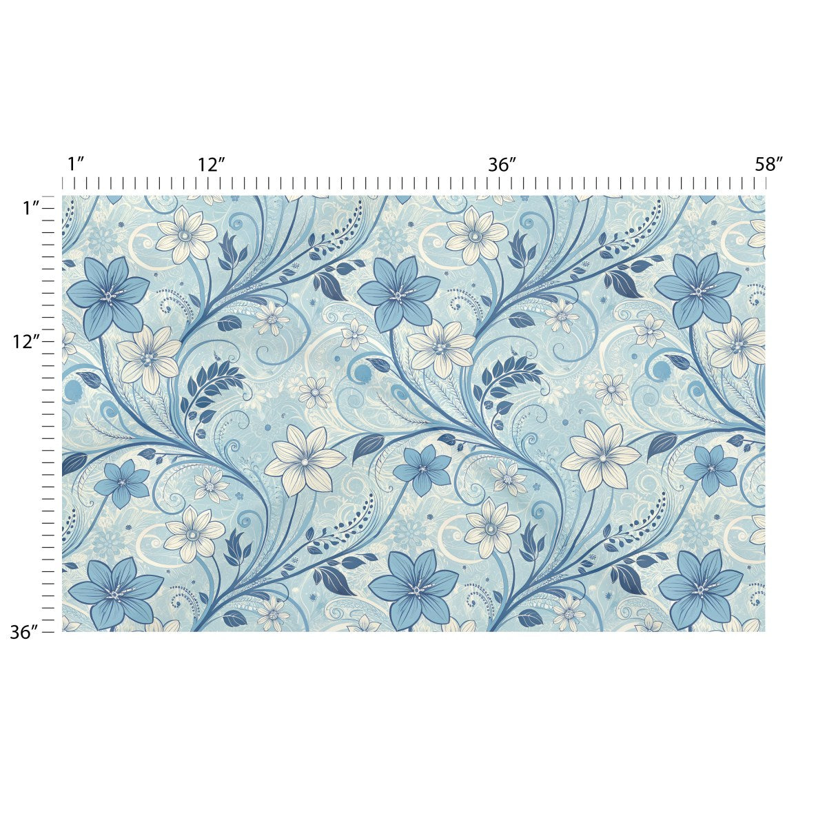 An elegant, seamless pattern of stylized flowers and swirling vines. The intricate design features a classic color palette of blue, navy, and cream against a light blue background, creating a delicate and decorative composition.