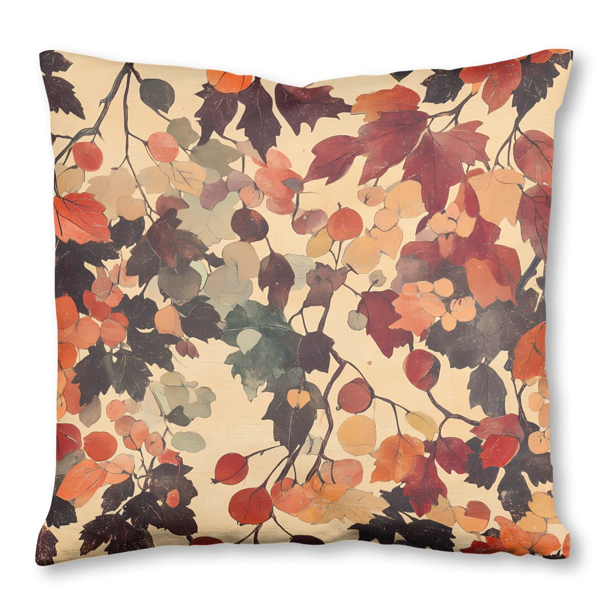 This stylized, artistic pattern features autumnal branches with leaves in rich reds, oranges, and deep purples. Clusters of round berries are scattered throughout the warm-toned foliage, set against a pale, textured background, creating a classic, decorative composition reminiscent of Japanese screen painting.