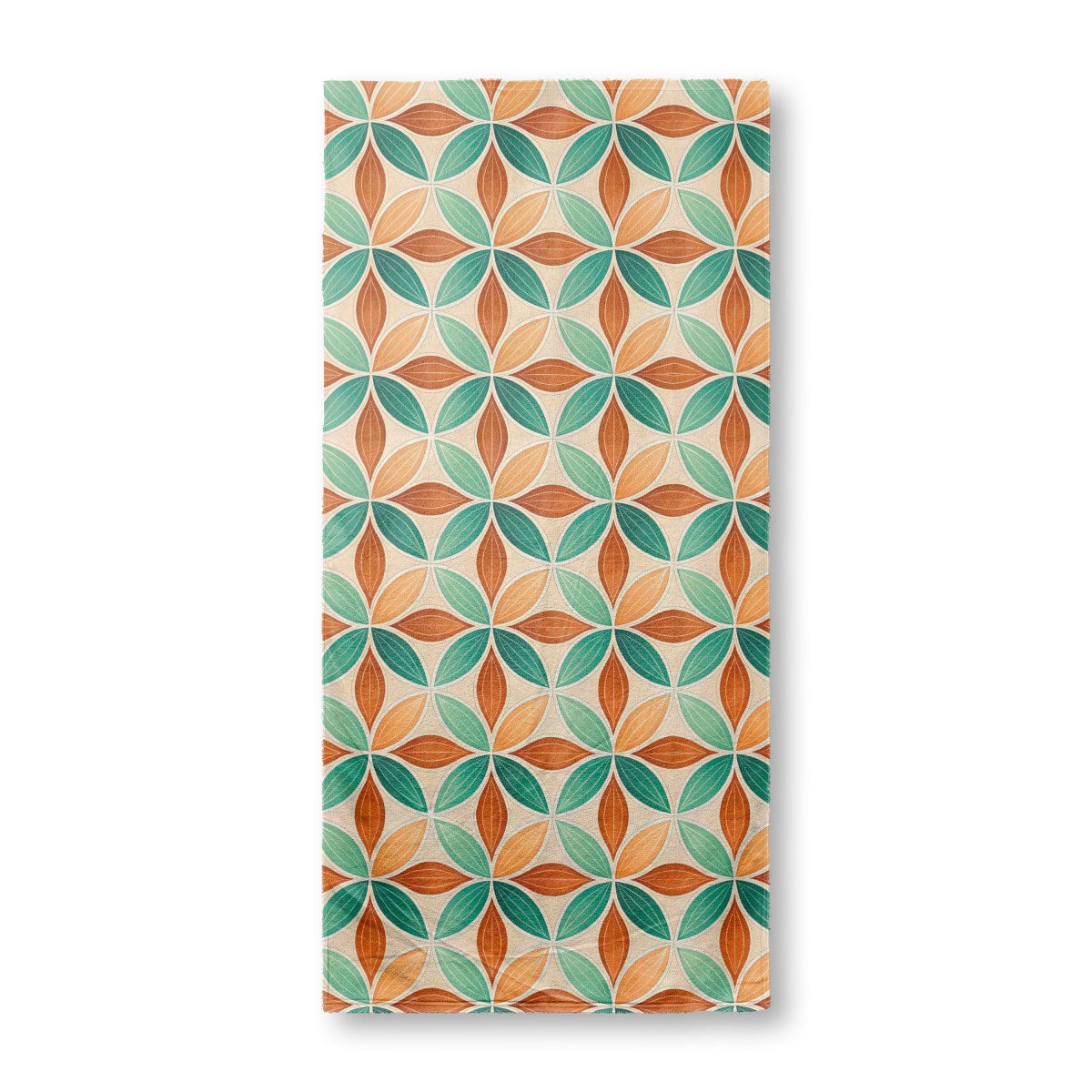 A retro geometric pattern featuring stylized flowers with alternating teal and terracotta-orange petals. The seamless design is set on a cream, textured background, creating the look of vintage ceramic tiles with a mid-century modern aesthetic.