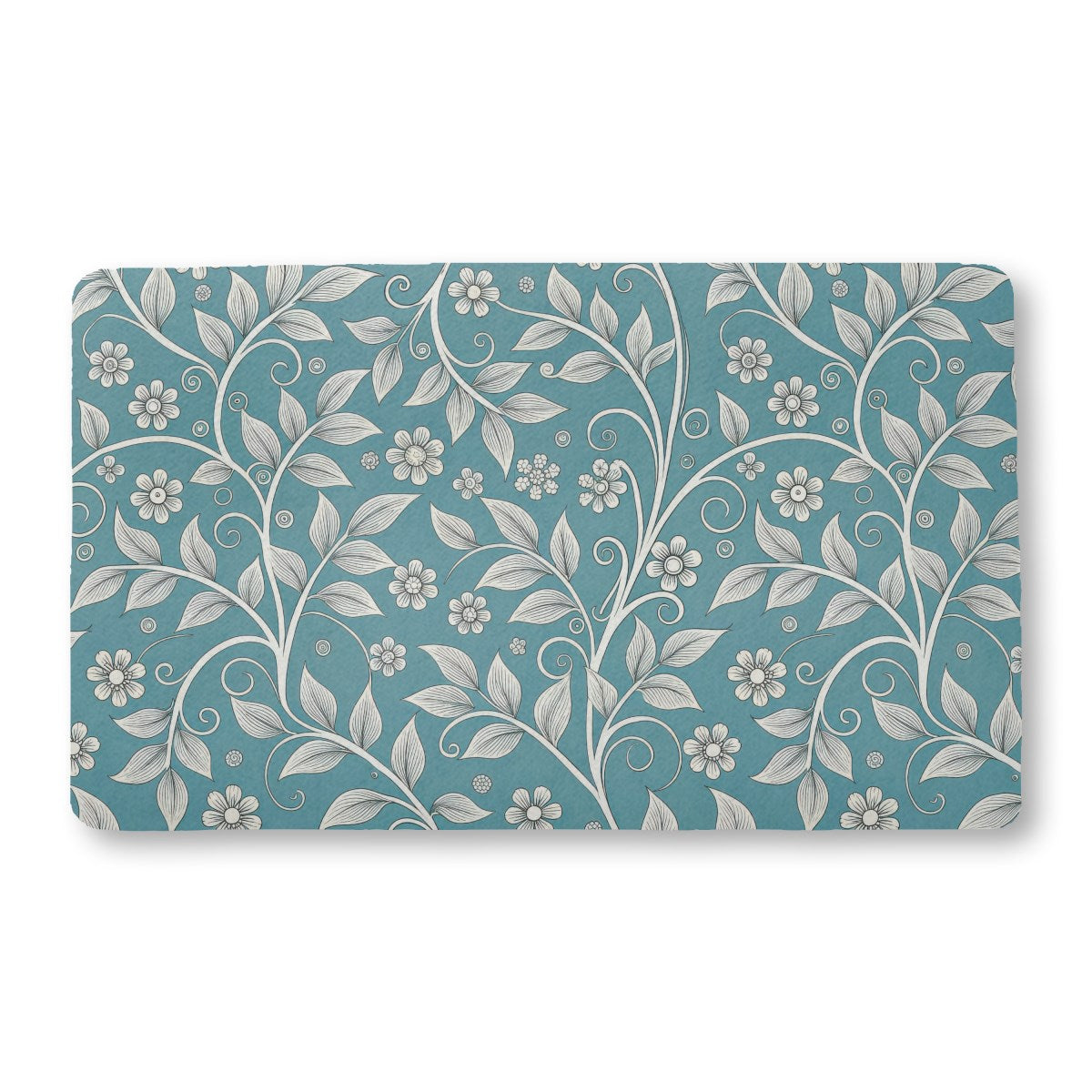 This is an elegant, seamless botanical pattern featuring intricate white line drawings of swirling vines, leaves, and small flowers. The delicate, classic design is set against a solid, muted teal-blue background, creating a sophisticated and vintage look.