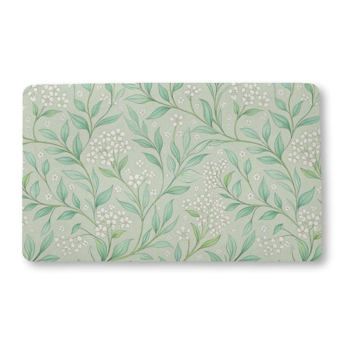 A serene, seamless botanical pattern of delicate white flowers and gracefully swirling green leaves. The elegant, illustrative design is set against a soft sage green background, creating a timeless and tranquil aesthetic with an Art Nouveau influence.