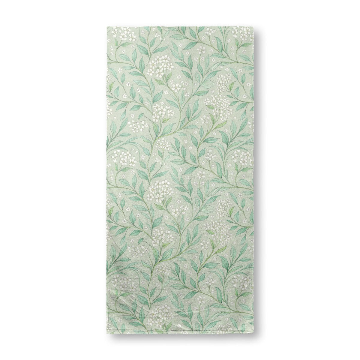 A serene, seamless botanical pattern of delicate white flowers and gracefully swirling green leaves. The elegant, illustrative design is set against a soft sage green background, creating a timeless and tranquil aesthetic with an Art Nouveau influence.