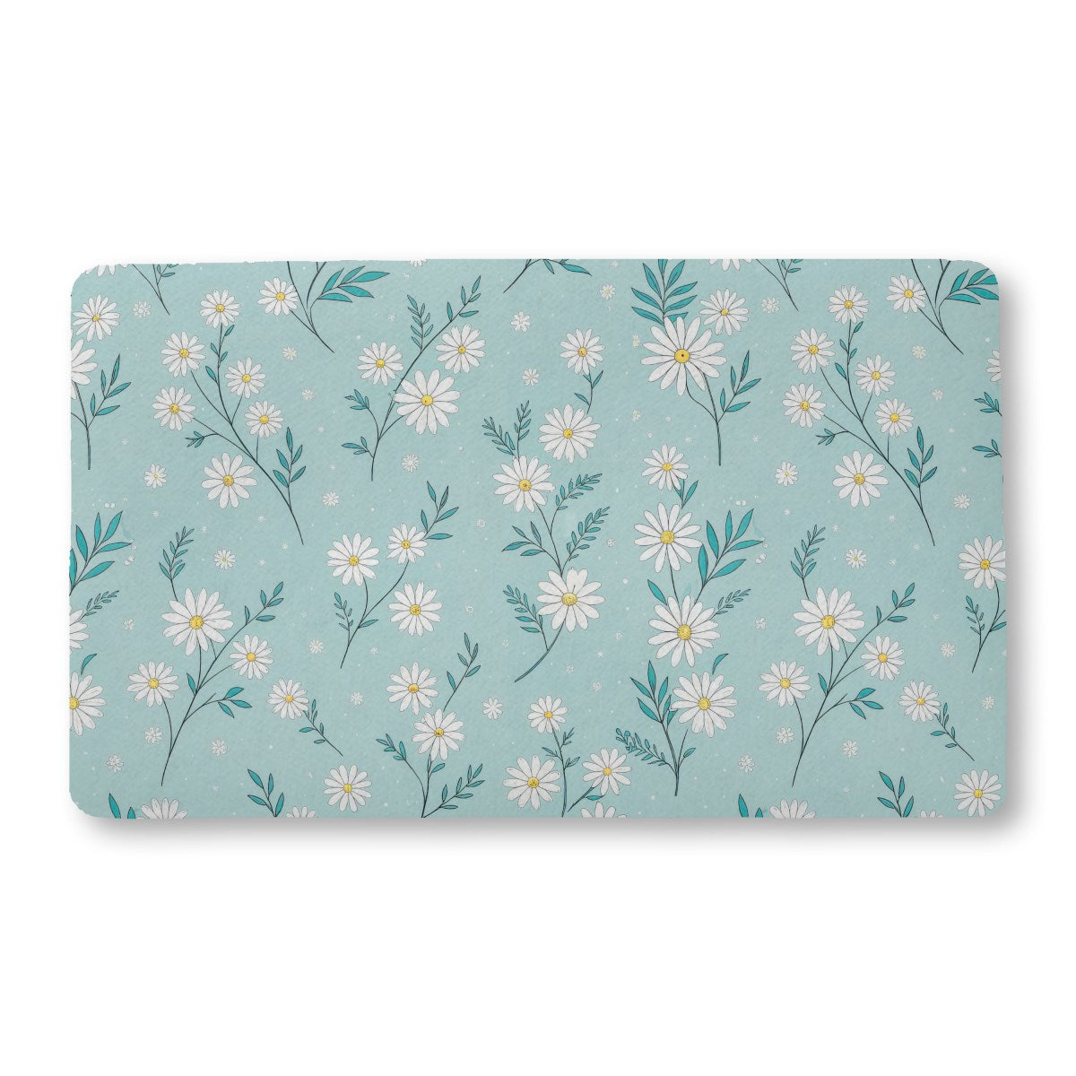 This is an illustrated, seamless pattern of delicate white daisies with yellow centers and teal leaves. The charming flowers are scattered across a speckled, light blue background, creating a fresh and whimsical design.