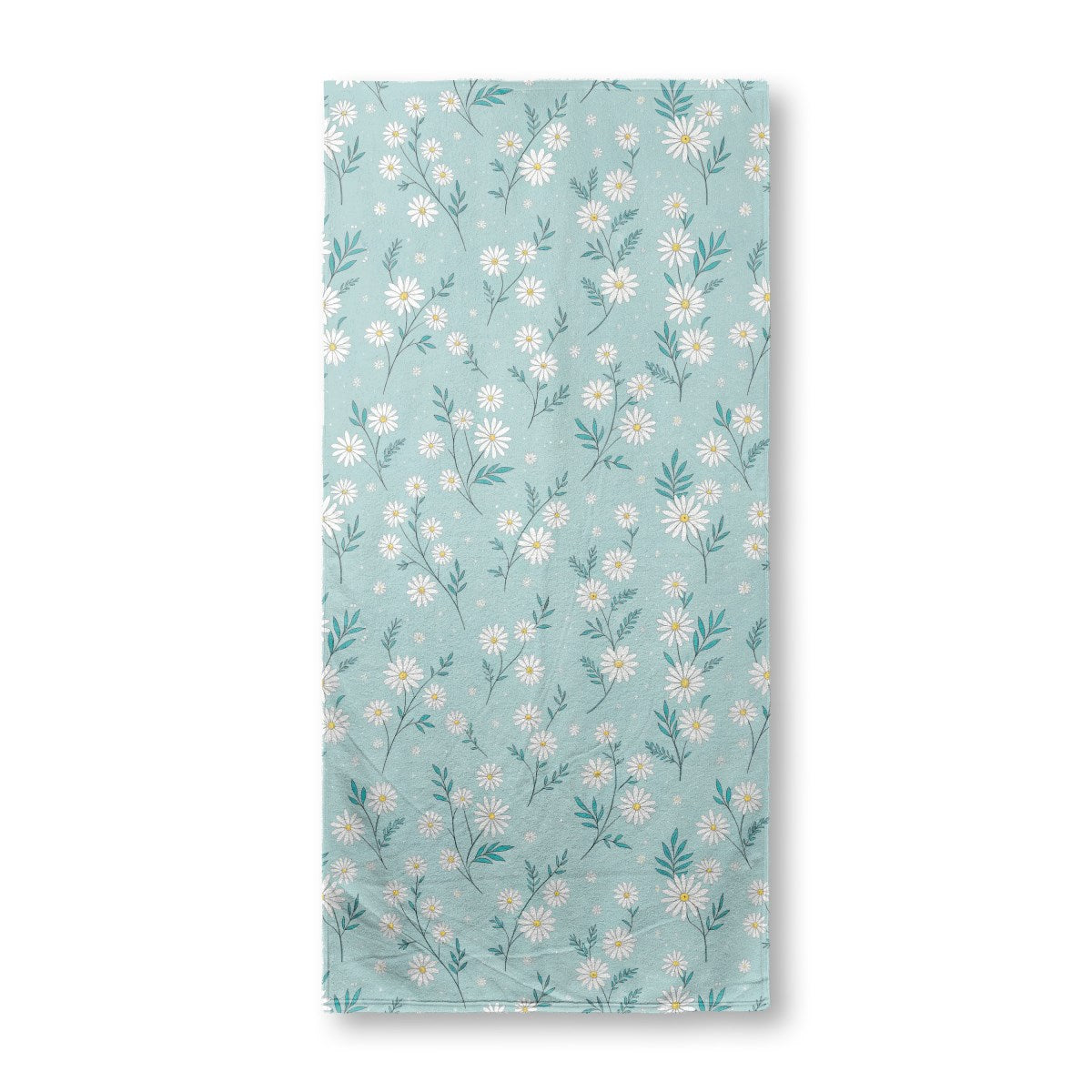 This is an illustrated, seamless pattern of delicate white daisies with yellow centers and teal leaves. The charming flowers are scattered across a speckled, light blue background, creating a fresh and whimsical design.