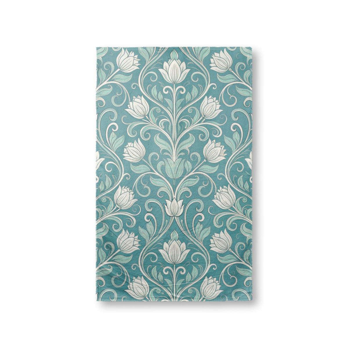 An elegant, symmetrical floral pattern in the Art Nouveau style. Stylized white and mint-green flowers are connected by swirling vines on a rich teal background, creating an intricate and decorative design reminiscent of vintage wallpaper.