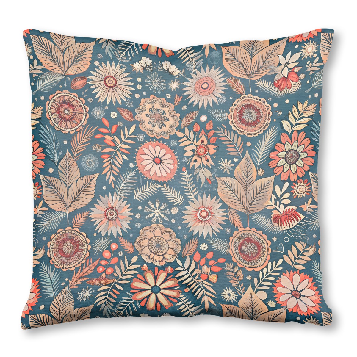 A dense, folk art-inspired pattern features stylized flowers, leaves, and ferns against a dark teal background. The illustration uses a warm, autumnal palette of rust, orange, and cream, creating a rich, vintage textile feel.