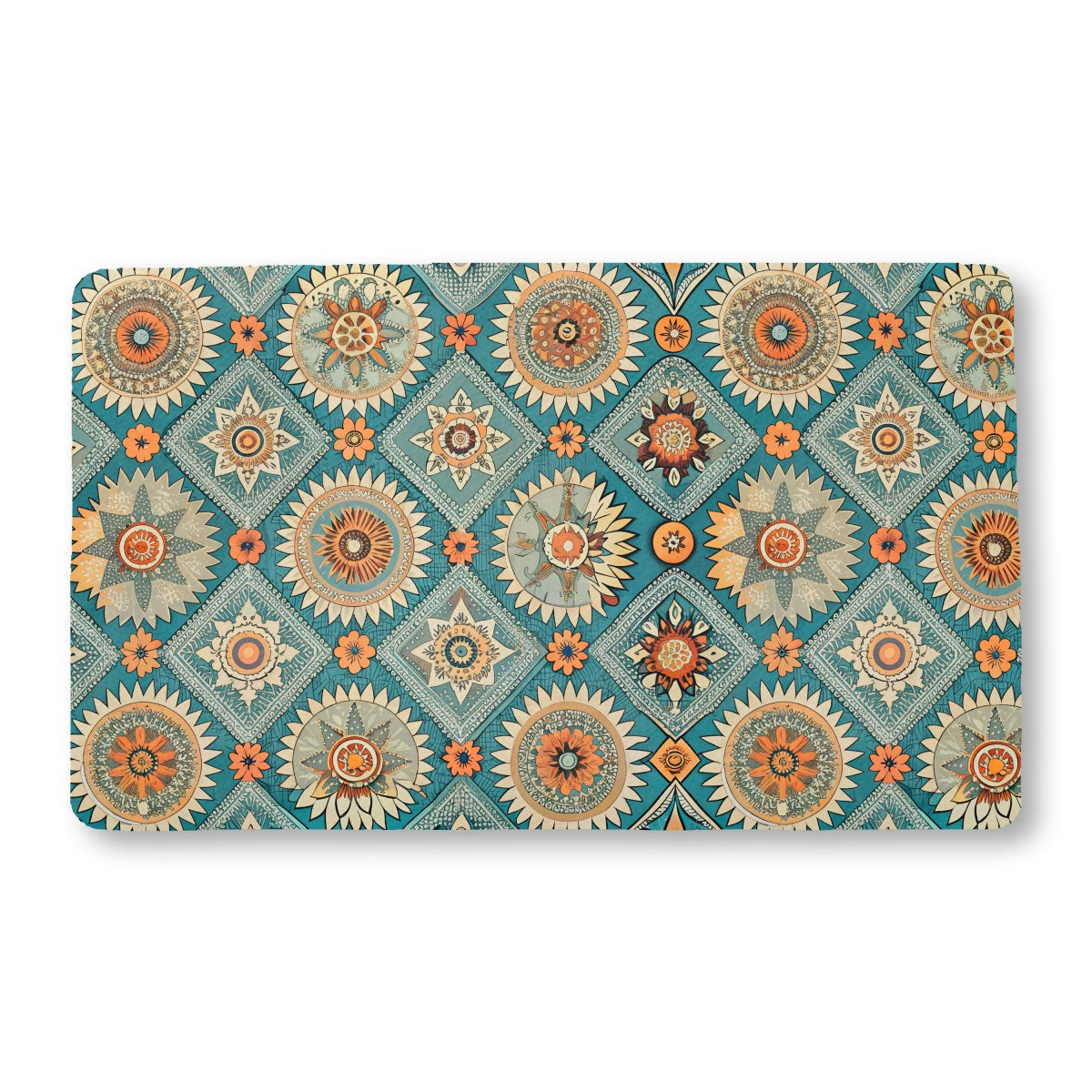 A vibrant, bohemian tile pattern features intricate sun and floral mandalas. The detailed orange, cream, and beige motifs are set within ornate diamond shapes on a rich teal background, creating a decorative, folk-art feel.