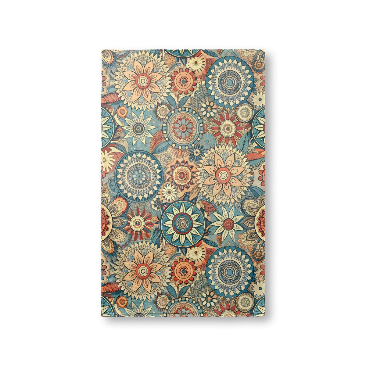 A dense, bohemian-style pattern of intricate, hand-drawn mandalas and stylized flowers. The collage-like design uses an earthy color palette of teal, orange, and cream, creating a vintage, folk-art feel.