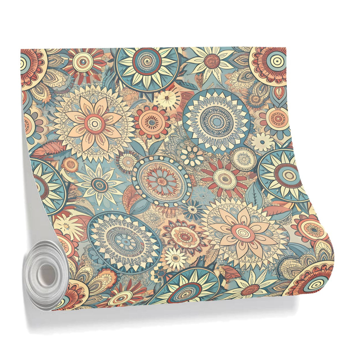 A dense, bohemian-style pattern of intricate, hand-drawn mandalas and stylized flowers. The collage-like design uses an earthy color palette of teal, orange, and cream, creating a vintage, folk-art feel.