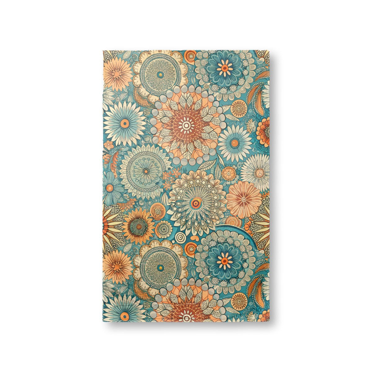 This is a vibrant, bohemian-style pattern featuring intricate, overlapping flowers and mandalas. The dense composition uses a striking color palette of teal, orange, and cream, creating a detailed and retro design with a folk-art aesthetic.