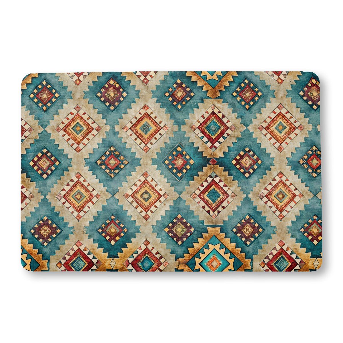 This image displays a richly textured, repeating geometric pattern with a Southwestern or tribal aesthetic. Jagged-edged diamonds in a palette of teal, red, and earthy tones create a rustic, weathered design reminiscent of a woven rug or textile.