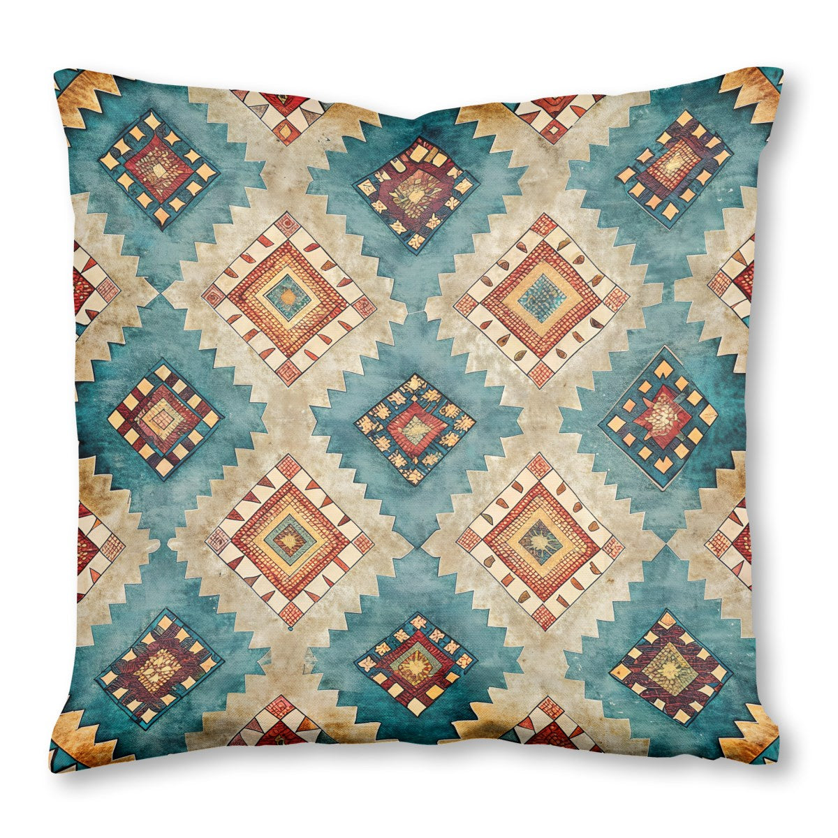 This image displays a richly textured, repeating geometric pattern with a Southwestern or tribal aesthetic. Jagged-edged diamonds in a palette of teal, red, and earthy tones create a rustic, weathered design reminiscent of a woven rug or textile.
