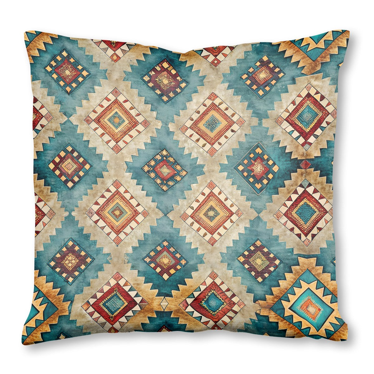 This image displays a richly textured, repeating geometric pattern with a Southwestern or tribal aesthetic. Jagged-edged diamonds in a palette of teal, red, and earthy tones create a rustic, weathered design reminiscent of a woven rug or textile.