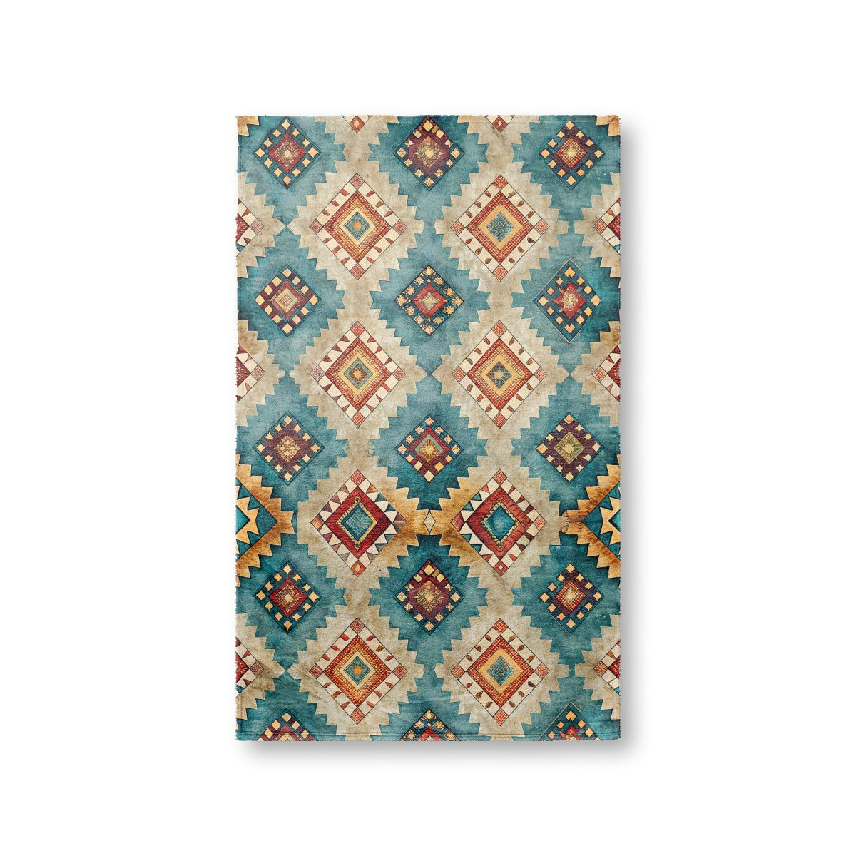 This image displays a richly textured, repeating geometric pattern with a Southwestern or tribal aesthetic. Jagged-edged diamonds in a palette of teal, red, and earthy tones create a rustic, weathered design reminiscent of a woven rug or textile.