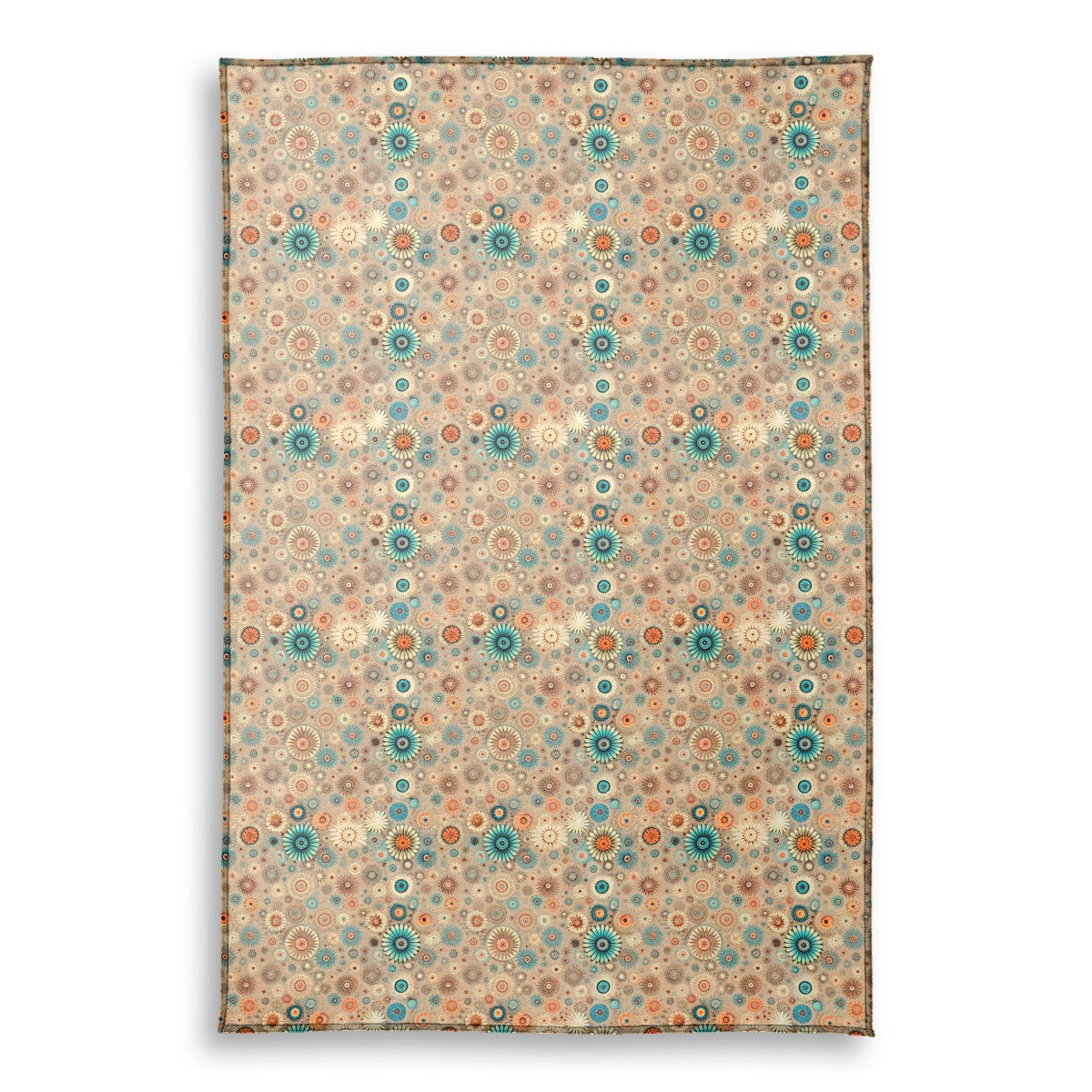 A dense, artistic collage of stylized flowers and circular motifs. The intricate designs feature a retro color palette of teal, orange, and earth tones against a textured background, creating a vibrant, bohemian-inspired pattern.