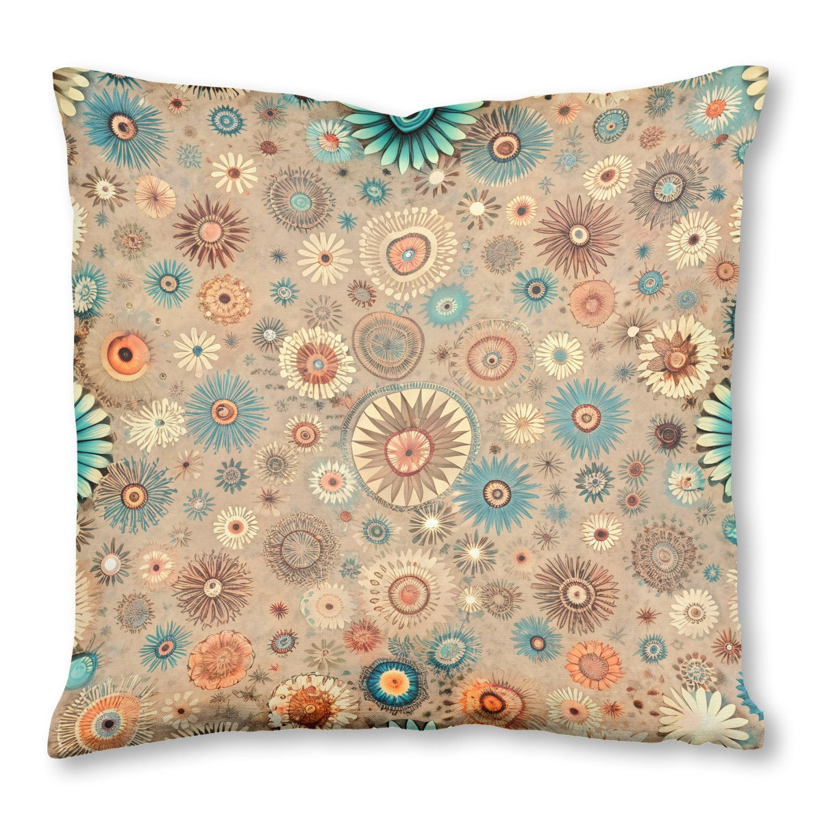 A dense, artistic collage of stylized flowers and circular motifs. The intricate designs feature a retro color palette of teal, orange, and earth tones against a textured background, creating a vibrant, bohemian-inspired pattern.