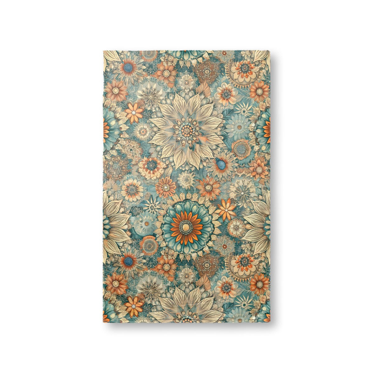 A dense, retro-style floral pattern features intricately detailed flowers. The busy, repeating design uses a striking color palette of teal, orange, and cream, creating a rich and decorative visual tapestry with a vintage, illustrative feel.