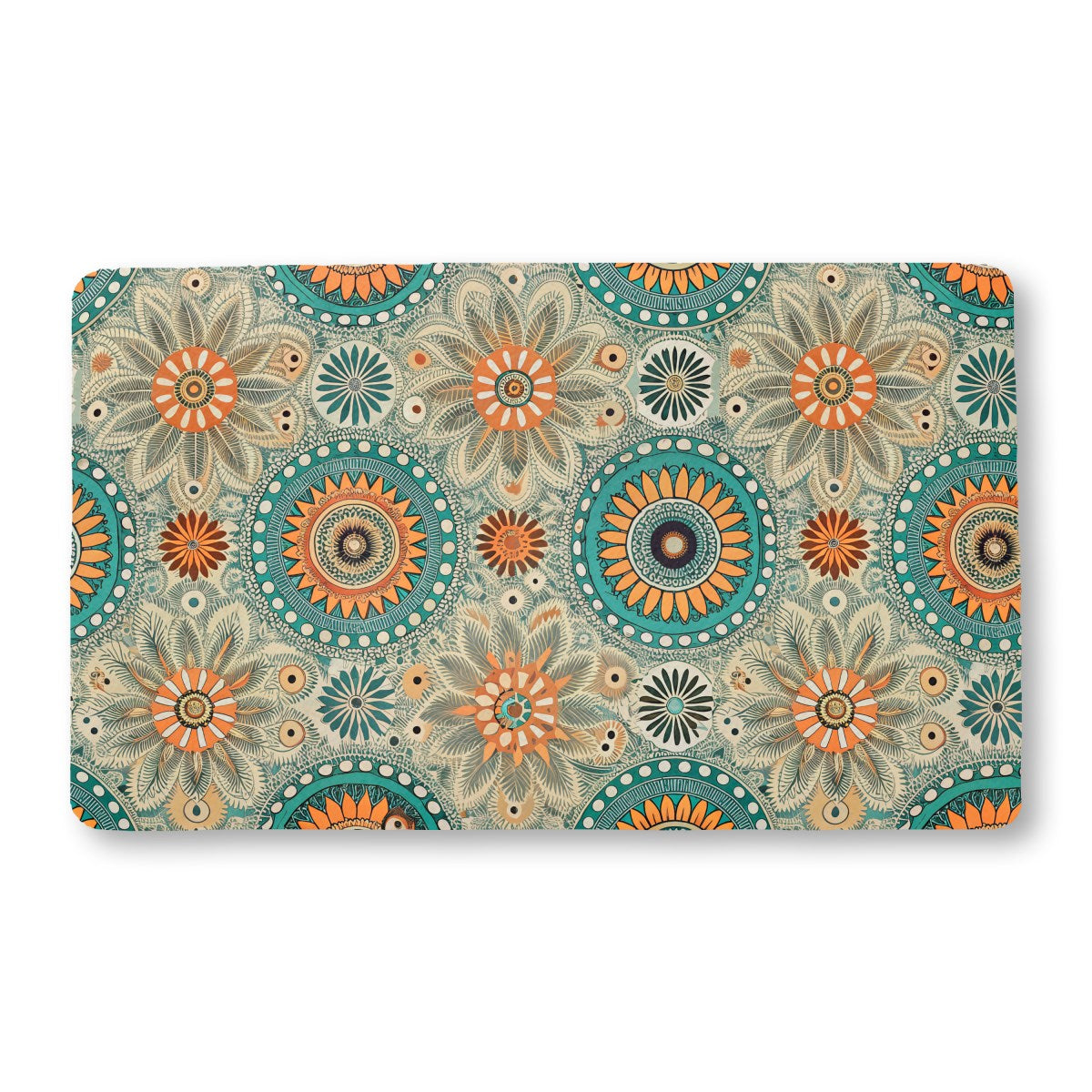 This is a vibrant, repeating pattern featuring intricate mandalas and stylized flowers in a bohemian, folk-art style. The design uses a striking color palette of teal, orange, and cream, with detailed line work and dotted textures creating a rich, layered effect.