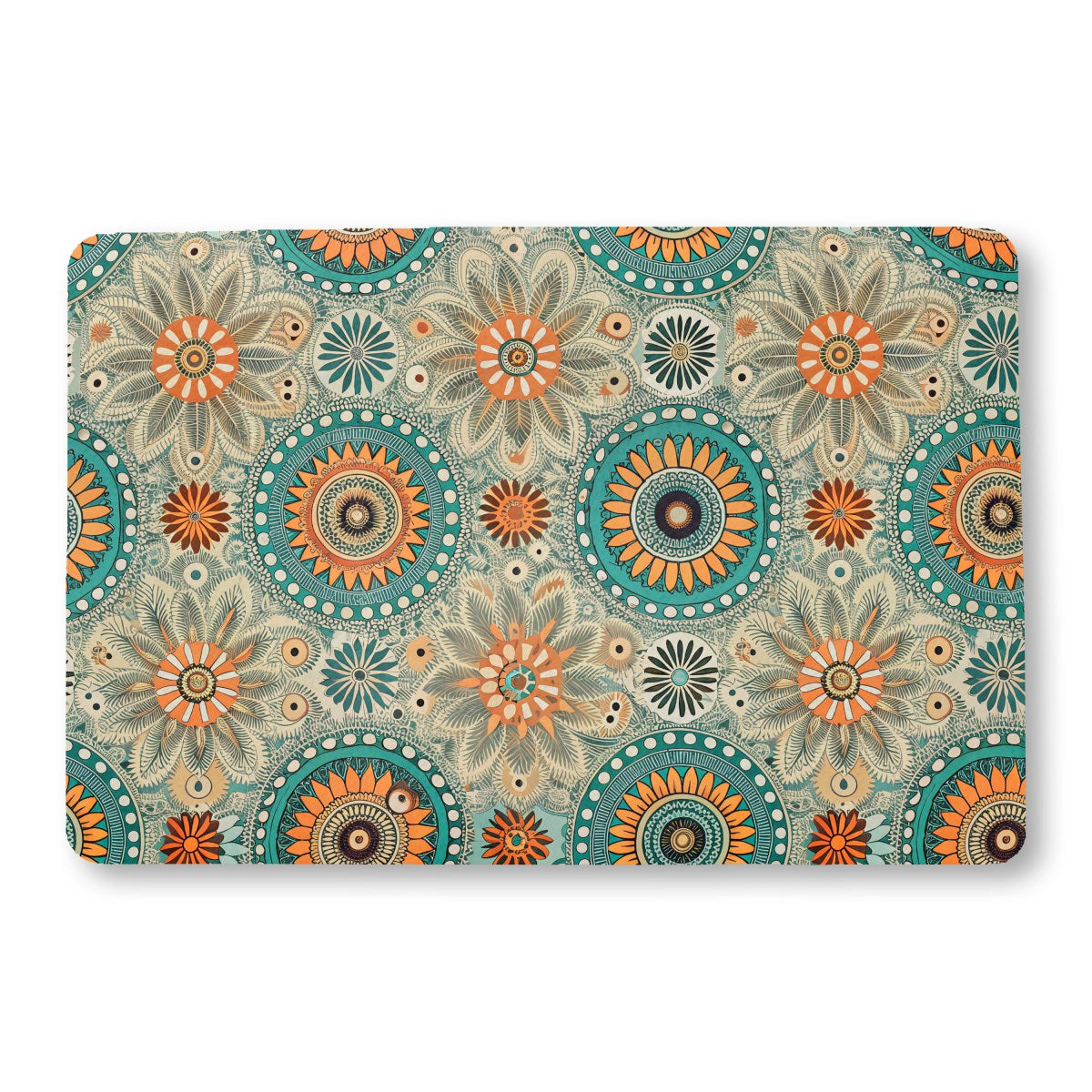 This is a vibrant, repeating pattern featuring intricate mandalas and stylized flowers in a bohemian, folk-art style. The design uses a striking color palette of teal, orange, and cream, with detailed line work and dotted textures creating a rich, layered effect.