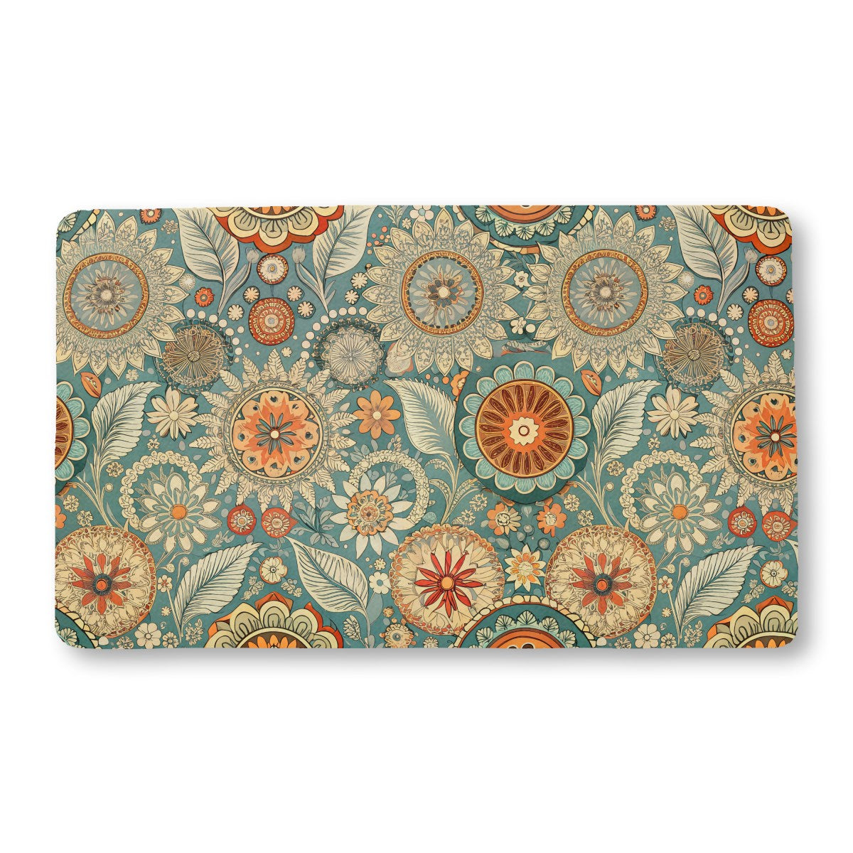 A vibrant, bohemian-style floral pattern featuring intricate, mandala-like flowers and stylized leaves. The rich color palette of teal, orange, and cream creates a warm, retro aesthetic on a dense, folk-art-inspired background.