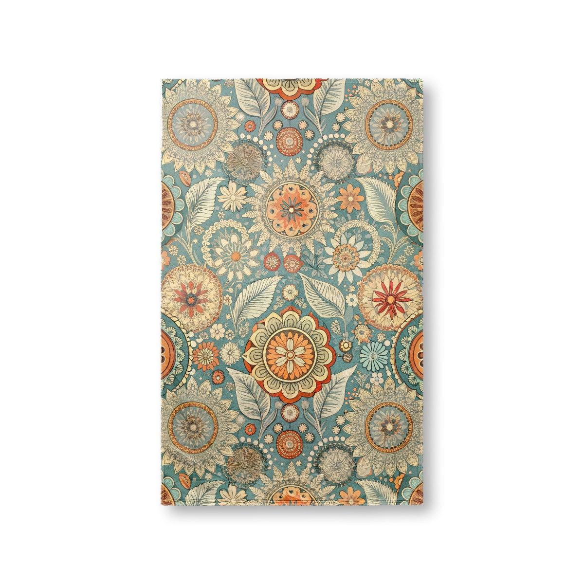 A vibrant, bohemian-style floral pattern featuring intricate, mandala-like flowers and stylized leaves. The rich color palette of teal, orange, and cream creates a warm, retro aesthetic on a dense, folk-art-inspired background.