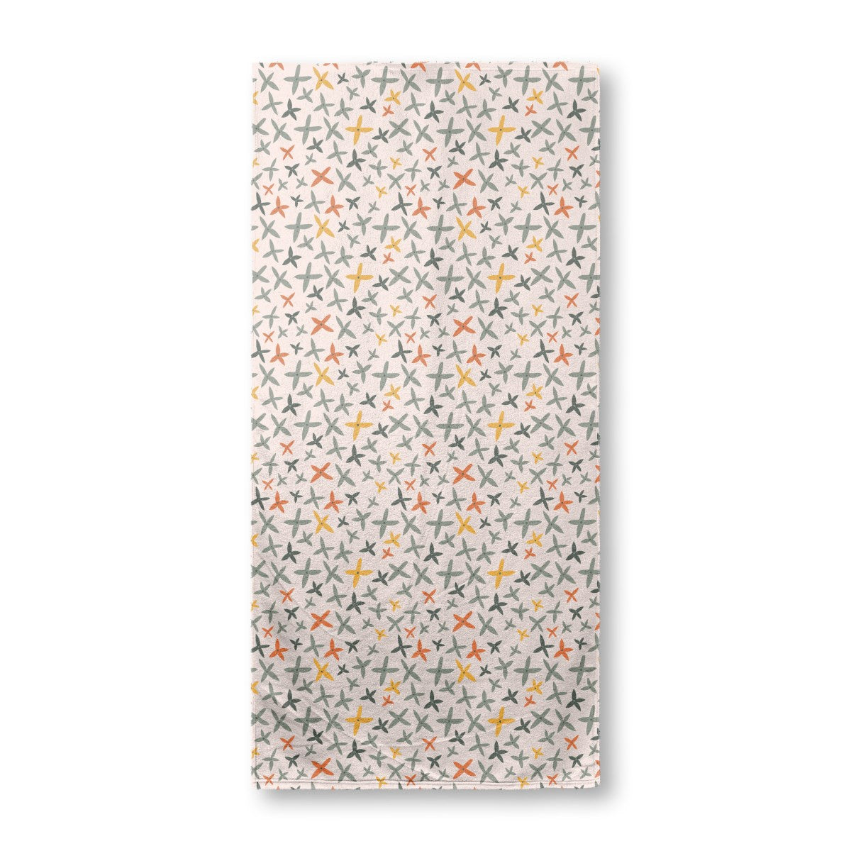 A seamless, modern pattern of stylized four-petaled flowers in varying sizes. The design features a muted, earthy color palette of green, orange, and yellow scattered playfully across a light, off-white background for a whimsical and abstract look.