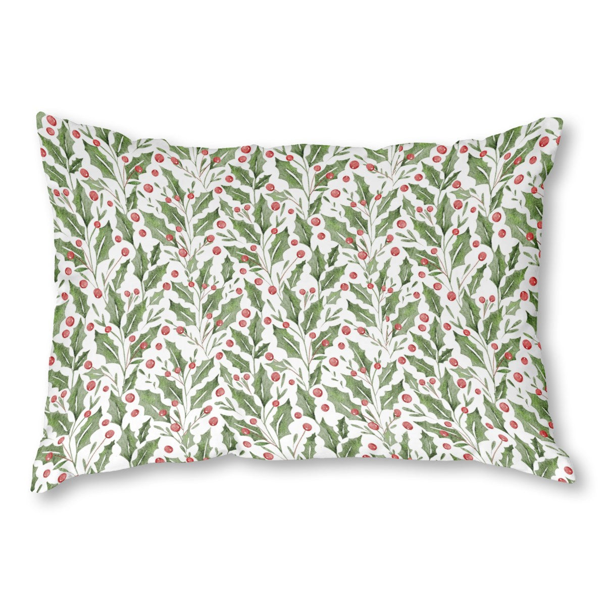 This is a seamless watercolor pattern of festive holly. Spiky green leaves and bright red berries are arranged in vertical sprigs against a white background, creating a classic and cheerful Christmas design.