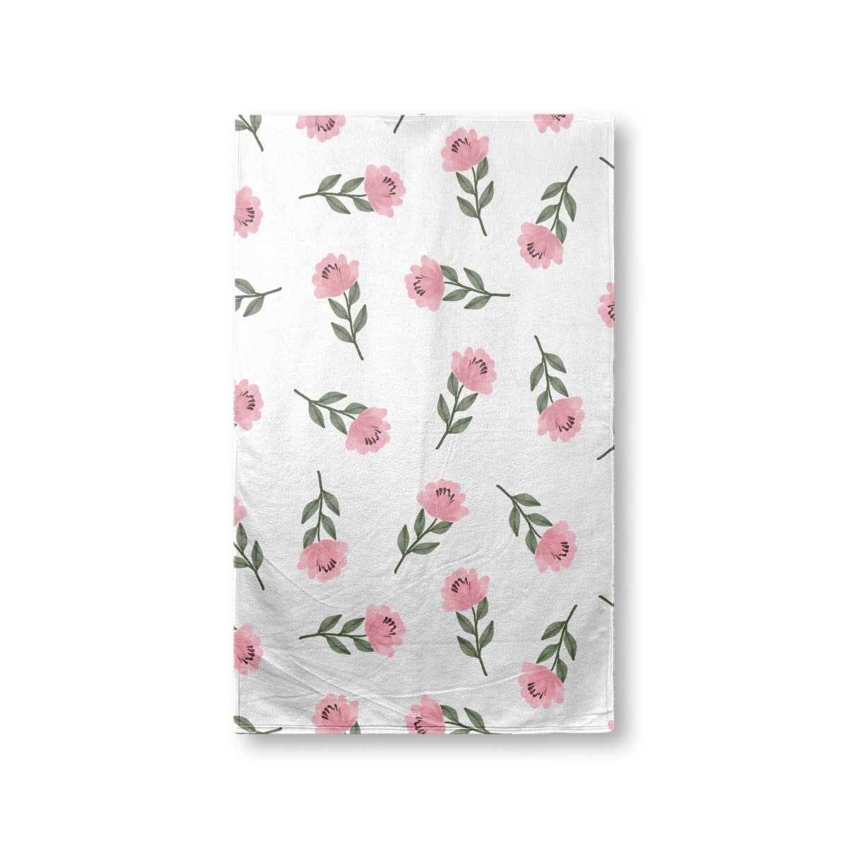 This is a seamless floral pattern featuring stylized pink flowers with a soft, watercolor-like texture. The simple blossoms, with scalloped petals and dark stamens, are attached to green leafy stems and scattered across a clean white background for a delicate and charming effect.