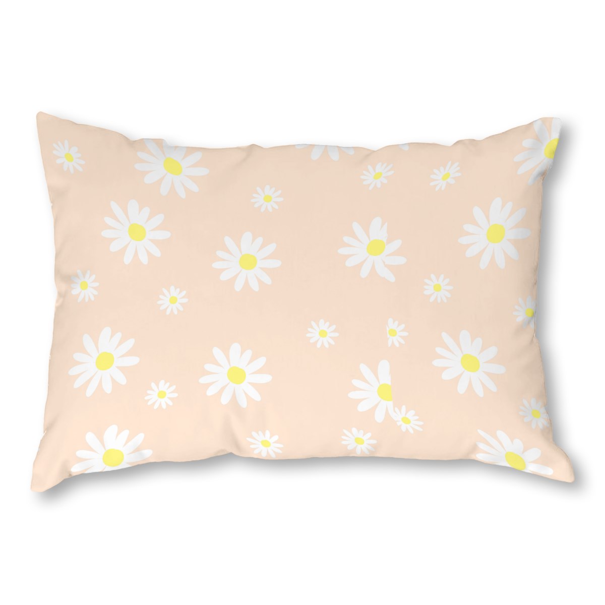 This is a simple, seamless pattern of stylized daisies. White flowers with yellow centers, in various sizes, are scattered across a soft, pale peach background for a sweet and gentle effect.