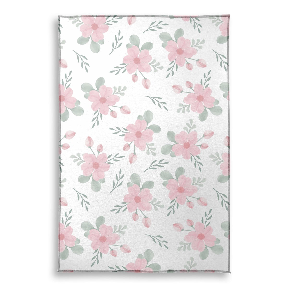 A seamless watercolor pattern featuring delicate pink flowers, buds, and sage green leaves. The gentle floral elements are scattered across a clean white background, creating a soft, elegant, and charming design suitable for textiles or wallpaper.