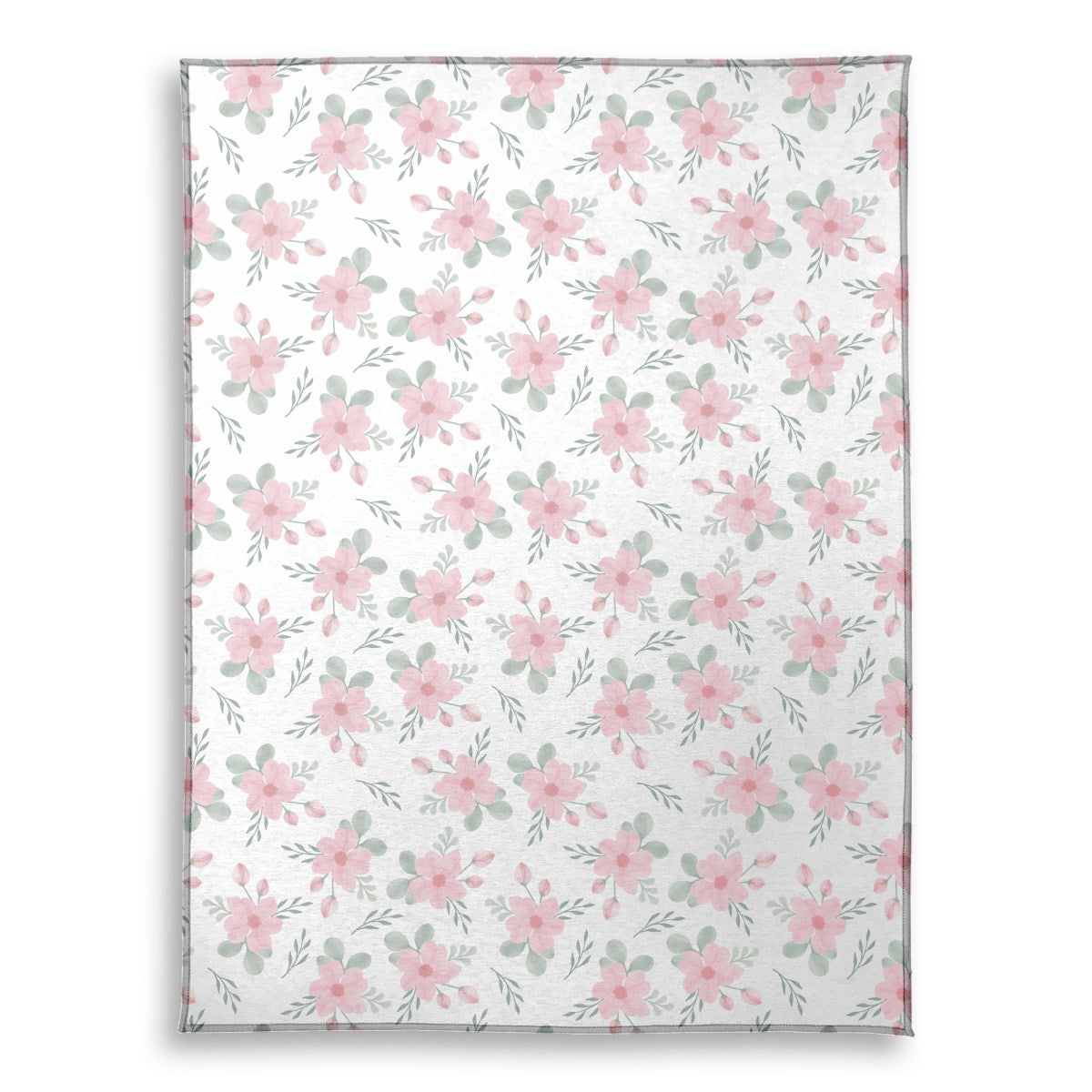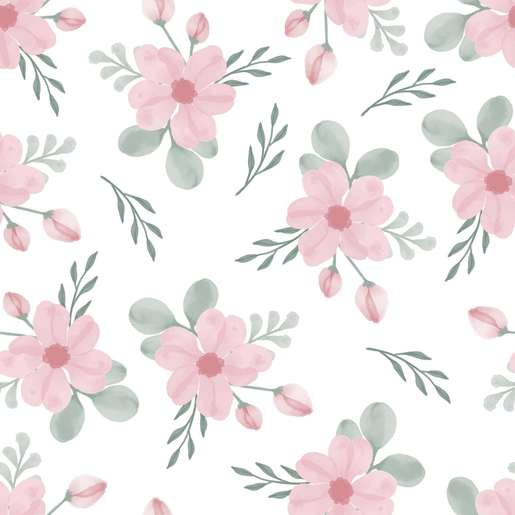 A seamless watercolor pattern featuring delicate pink flowers, buds, and sage green leaves. The gentle floral elements are scattered across a clean white background, creating a soft, elegant, and charming design suitable for textiles or wallpaper.