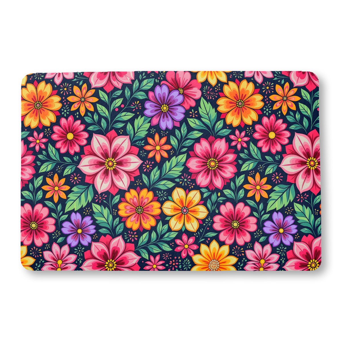 A vibrant, seamless pattern of stylized folk-art flowers. The bold, colorful blossoms in shades of pink, orange, and purple, along with green leaves, stand out against a dark navy background, creating a dense and cheerful composition.