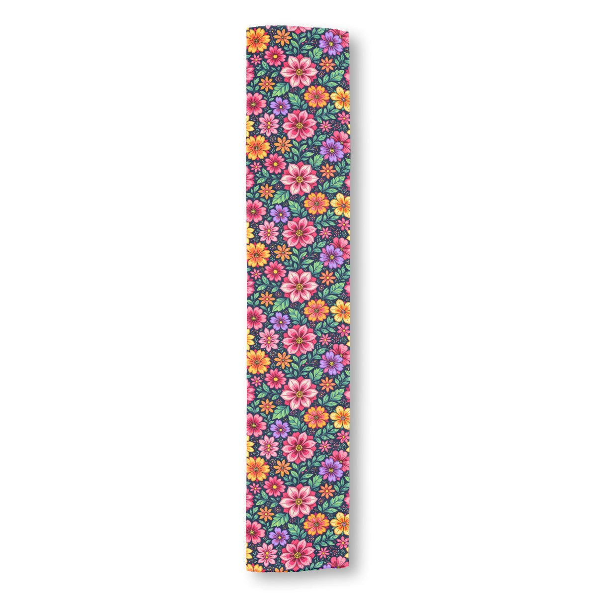 A vibrant, seamless pattern of stylized folk-art flowers. The bold, colorful blossoms in shades of pink, orange, and purple, along with green leaves, stand out against a dark navy background, creating a dense and cheerful composition.