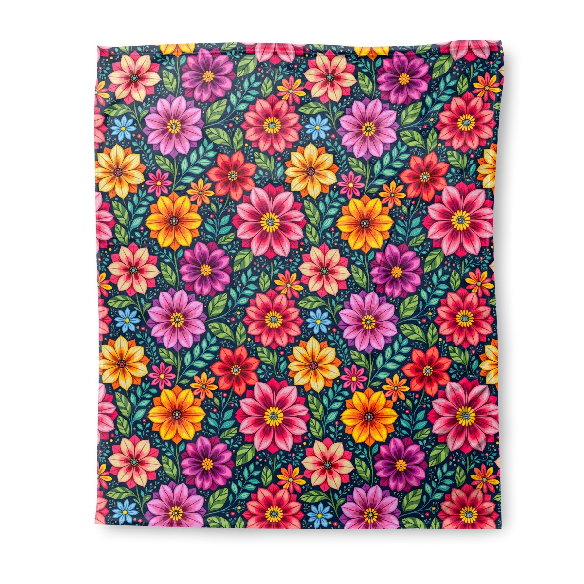 A vibrant, seamless pattern of stylized flowers in a folk art style. Bold, colorful blossoms in shades of pink, orange, and purple pop against a dark navy background, intertwined with green leaves to create a dense and cheerful composition.