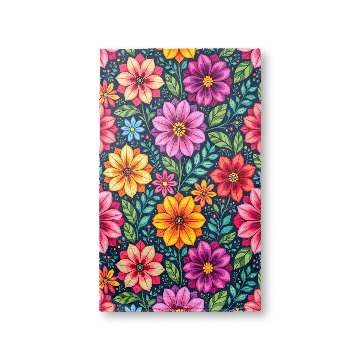 A vibrant, seamless pattern of stylized flowers in a folk art style. Bold, colorful blossoms in shades of pink, orange, and purple pop against a dark navy background, intertwined with green leaves to create a dense and cheerful composition.