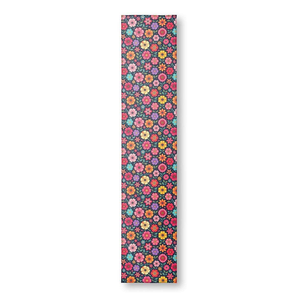 A vibrant, seamless pattern of stylized, colorful flowers in shades of pink, red, orange, and purple. The cheerful blossoms and green leaves pop against a dark navy-blue background, creating a dense and lively folk-art-inspired design.