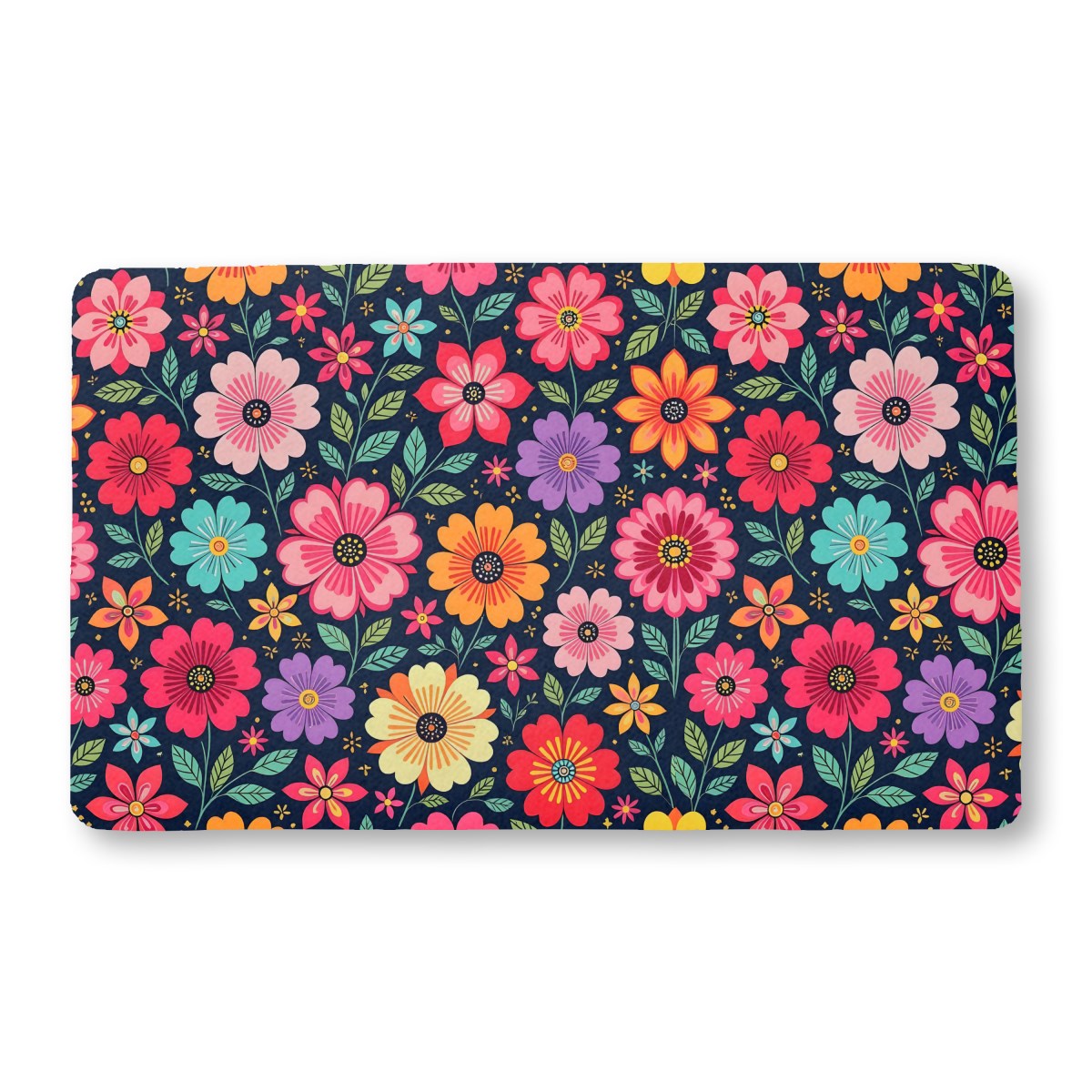 A vibrant, seamless pattern of stylized, colorful flowers in shades of pink, red, orange, and purple. The cheerful blossoms and green leaves pop against a dark navy-blue background, creating a dense and lively folk-art-inspired design.