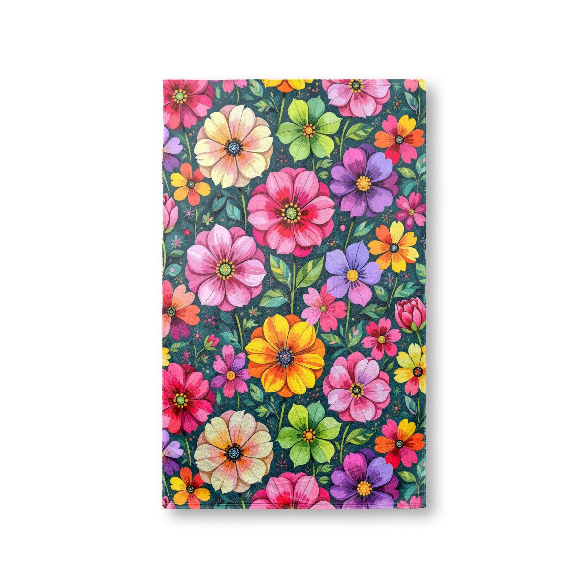 A vibrant, stylized floral pattern featuring a dense arrangement of multicolored flowers. Bright pinks, purples, oranges, and yellows pop against a dark teal background, creating a cheerful and energetic composition.