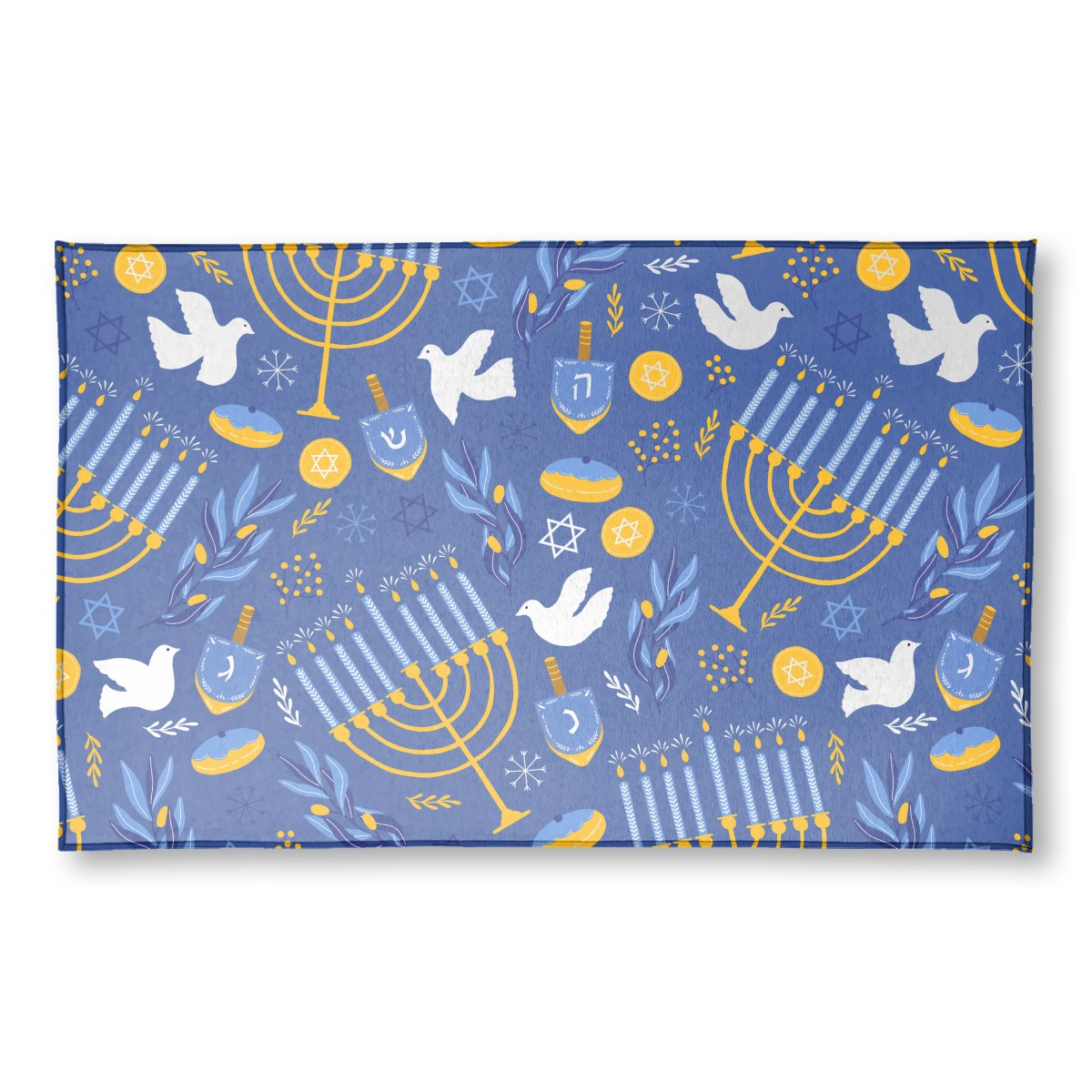 A festive, repeating pattern celebrating Hanukkah on a blue background. The design features illustrations of menorahs, dreidels, sufganiyot (doughnuts), Stars of David, and white doves in a cheerful yellow, blue, and white color palette, creating a joyful holiday theme.
