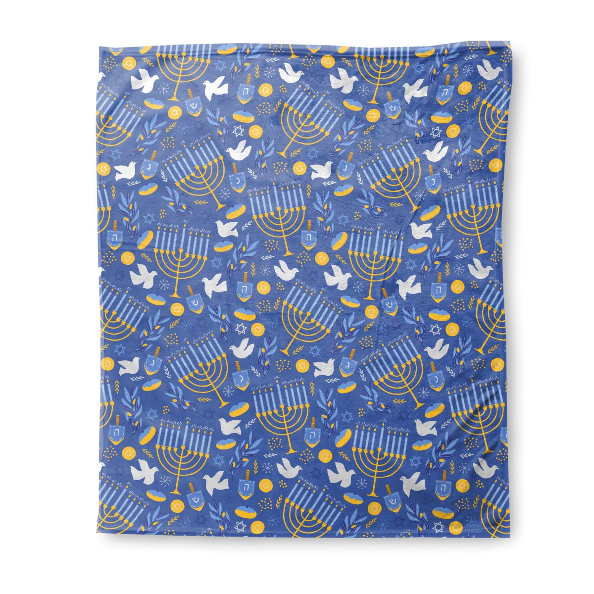 A festive, repeating pattern celebrating Hanukkah on a blue background. The design features illustrations of menorahs, dreidels, sufganiyot (doughnuts), Stars of David, and white doves in a cheerful yellow, blue, and white color palette, creating a joyful holiday theme.