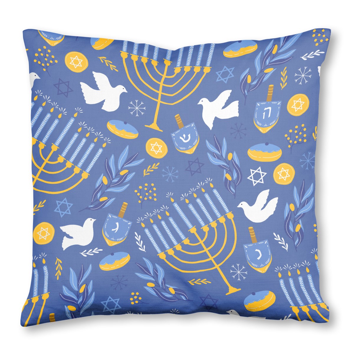 A festive, repeating pattern celebrating Hanukkah on a blue background. The design features illustrations of menorahs, dreidels, sufganiyot (doughnuts), Stars of David, and white doves in a cheerful yellow, blue, and white color palette, creating a joyful holiday theme.