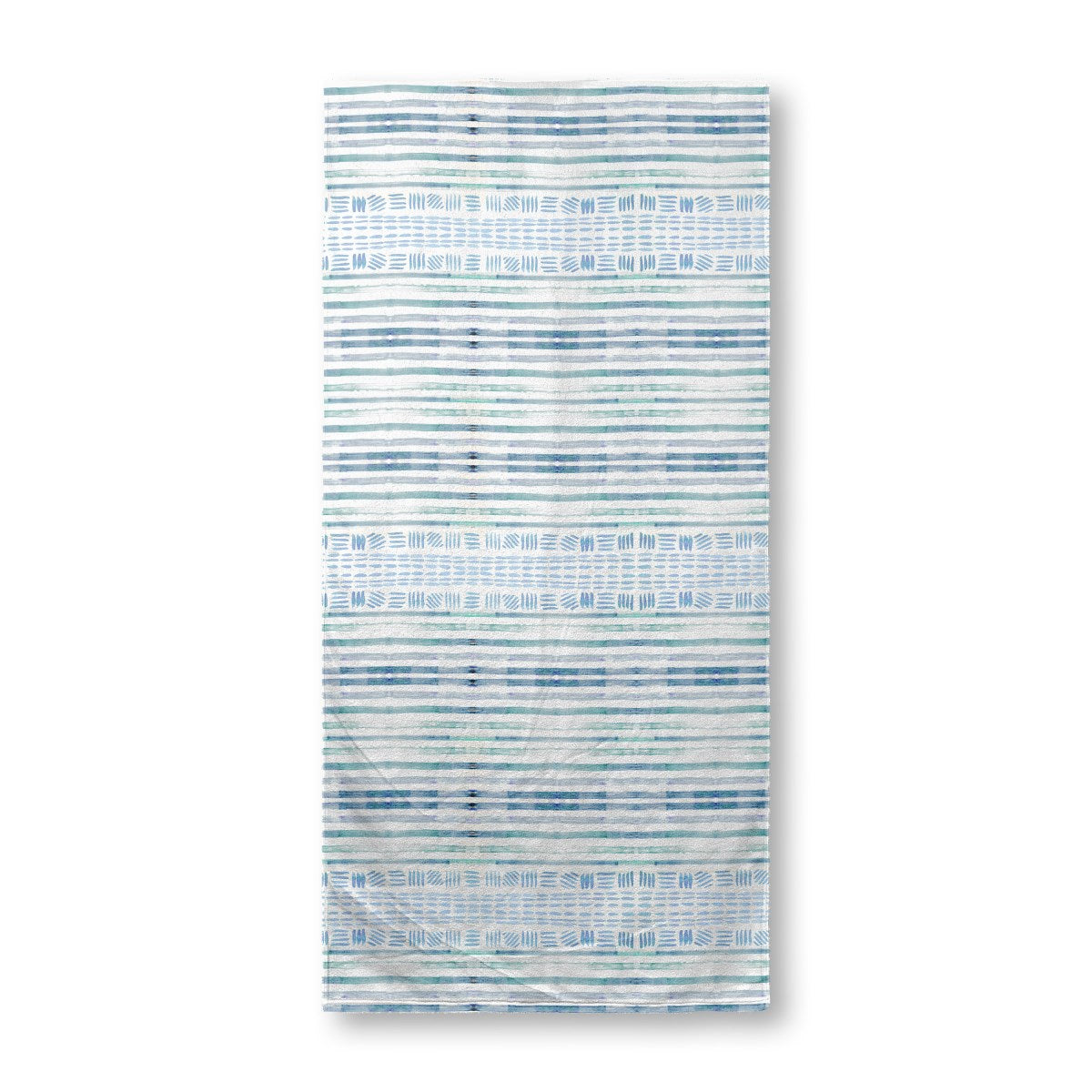 The image is a watercolor painting featuring a repeating pattern. The main design consists of broad horizontal stripes in varying shades of blue and teal, interspersed with thinner stripes of white. A central band displays a more intricate pattern of smaller, stylized shapes, including dashes, dots and small oblong forms, also in varying shades of blue. The overall effect is a harmonious blend of simple stripes and a more textured, almost tribal-inspired pattern. The color palette is cool and calming, emphasizing shades of blue and teal against a white background. The pattern is symmetrical, reflecting across both the horizontal and vertical axes.
