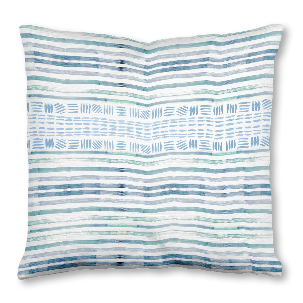 The image is a watercolor painting featuring a repeating pattern. The main design consists of broad horizontal stripes in varying shades of blue and teal, interspersed with thinner stripes of white. A central band displays a more intricate pattern of smaller, stylized shapes, including dashes, dots and small oblong forms, also in varying shades of blue. The overall effect is a harmonious blend of simple stripes and a more textured, almost tribal-inspired pattern. The color palette is cool and calming, emphasizing shades of blue and teal against a white background. The pattern is symmetrical, reflecting across both the horizontal and vertical axes.