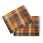 A close-up of a textured plaid fabric in a warm, autumnal color palette. The classic tartan pattern features intersecting stripes of brown, orange, mustard yellow, and beige, creating a cozy and rustic look.
