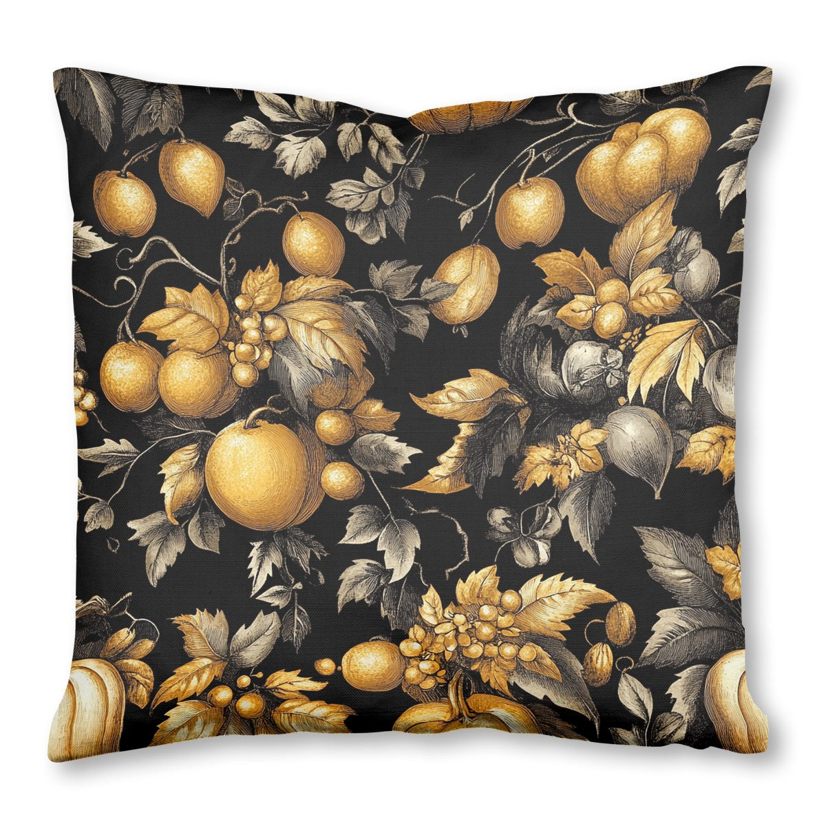 A luxurious, vintage-style pattern of autumnal fruits and foliage. Rendered in a detailed engraving style, golden pumpkins, apples, and grapes contrast richly with silver-toned leaves against a dramatic black background, creating an opulent and seamless design.