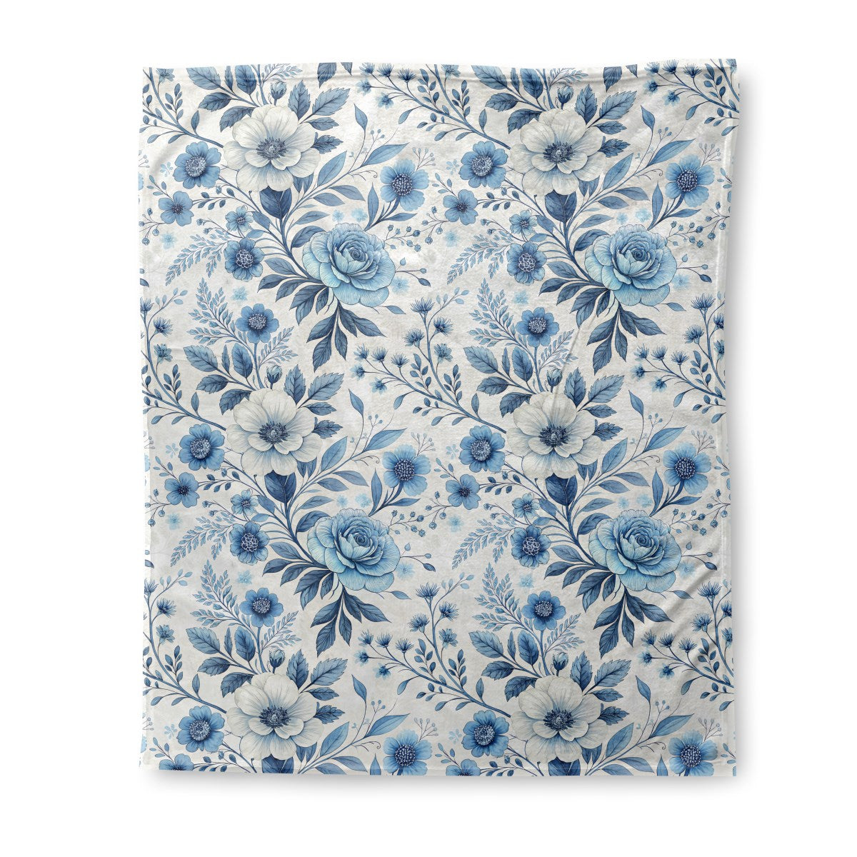 This is an elegant, seamless floral pattern featuring intricate blue and white flowers and leaves. Rendered in a delicate, watercolor or ink-wash style on a light, textured background, the design evokes the classic beauty of porcelain or fine textiles.