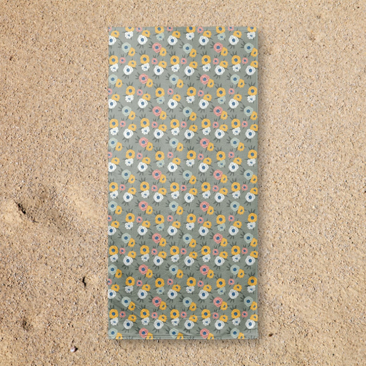 A repeating pattern of stylized flowers in yellow, pink, white, and pale blue on a muted gray-green background. Each flower features a dark blue center with white polka dots, creating a charming and whimsical design with a retro feel.