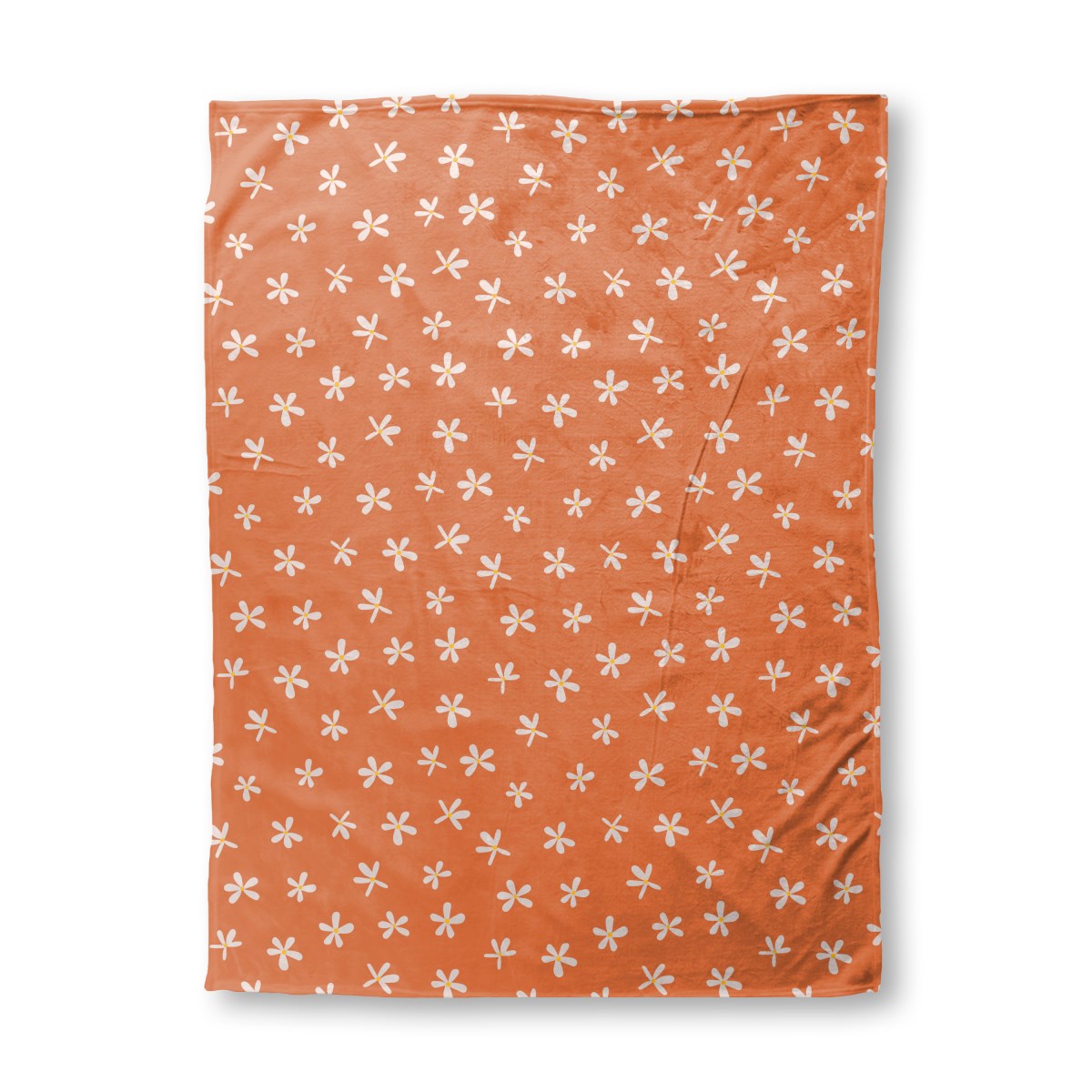 A seamless floral pattern featuring small, simple white flowers with yellow centers. The stylized blossoms are scattered across a warm, terracotta-colored background, creating a charming and minimalist design with a hand-drawn feel.