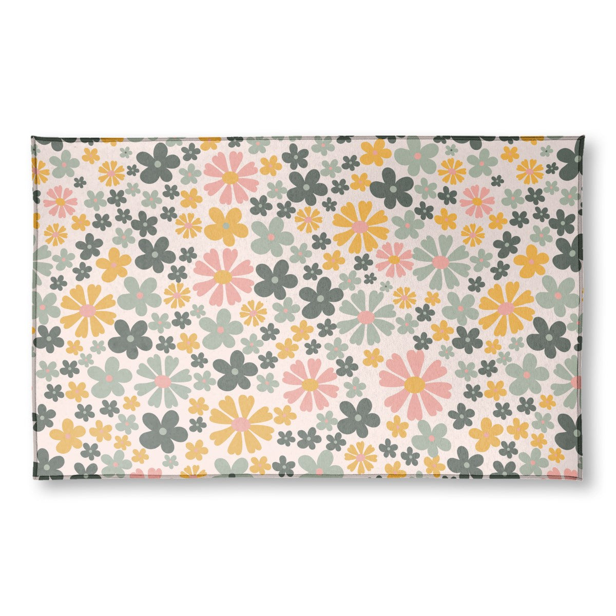 A retro-inspired, seamless pattern of stylized flowers. The ditsy floral print uses a muted color palette of pink, mustard yellow, sage, and dark green against a cream background, creating a groovy, 1970s aesthetic.