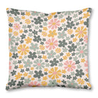 A retro-inspired, seamless pattern of stylized flowers. The ditsy floral print uses a muted color palette of pink, mustard yellow, sage, and dark green against a cream background, creating a groovy, 1970s aesthetic.